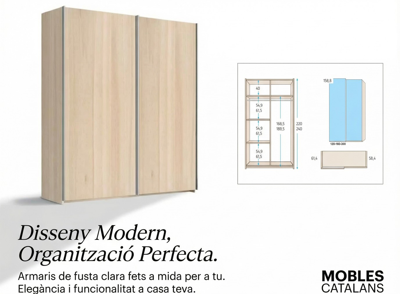 Interior acabat en color lli i distribució segons fotografia, optimitzat per a un màxim aprofitament de l’espai. Exterior disponible en diferents colors per adaptar-se a qualsevol estil de dormitori.