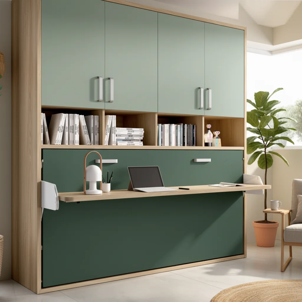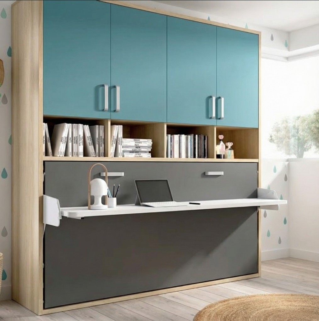 Cama abatible horizontal con armario superior, hueco de estanterías y práctico escritorio incorporado.