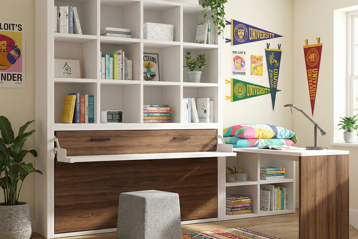 En Muebles Detena, tu tienda de muebles en Badalona, te presentamos esta cama abatible con escritorio y librería superior, una solución ideal para dormitorios juveniles, habitaciones pequeñas y espacios multifuncionales.