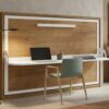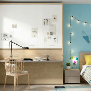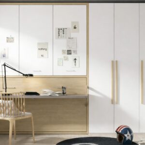 Cama abatible con escritorio y armario de puertas correderas superior.