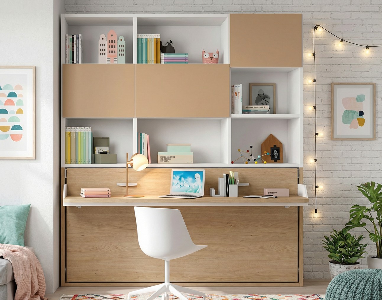 Descubre nuestra cama abatible con escritorio integrado y librería superior de 3 puertas, una solución moderna, funcional y elegante ideal para optimizar espacios en dormitorios juveniles, habitaciones pequeñas o estudios en Badalona y Barcelona.
