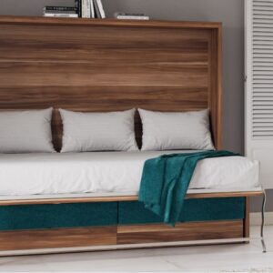 Cama abatible con sistema de apertura horizontal con altillo superior y con sofá incorporado con arcón,con pistones para apertura segura,somier interior de láminas de madera,con rebaje trasero para salvar el zócalo.