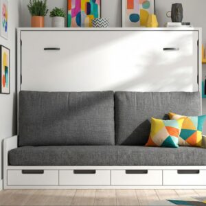 Cama abatible de matrimonio con sofá incorporado y cajones inferiores con guías metálicas,para colchón de 135×190,con somier de láminas interior,pistones hidrahúlicos y diferentes opciones de color a elegir.