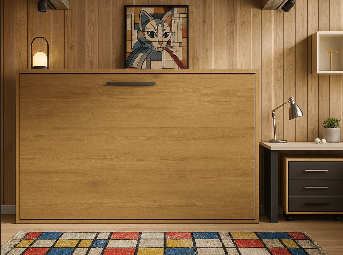 Cama abatible horizontal para colchón de 135 x 190,ANCHO TOTAL DE 207, altura total 153 cm,fondo 40 cerrada y 161 abierta, con somier de láminas,frontal de madera en el color que más te guste. Disponemos de una gran variedad de acabados y colores.