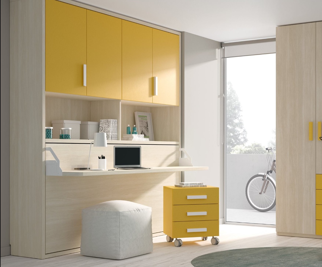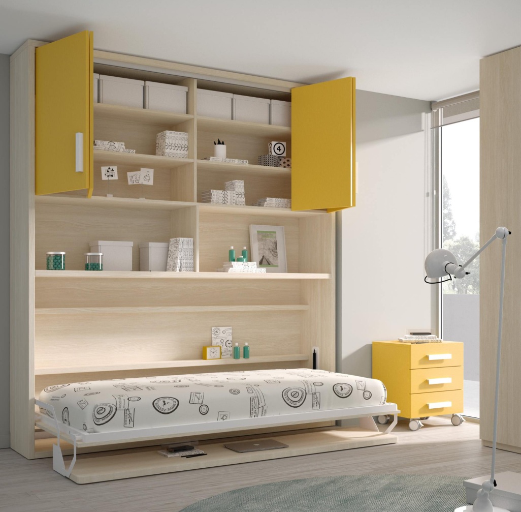 Cama abatible horizontal con armario superior y hueco central,puertas superiores plegables,con estanterias interiores dentro de la cama,incluye cinchas sujeta colchón,somier de láminas,bloqueo de seguridad,estructura de 3,5.