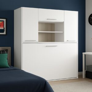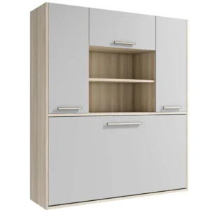 Conjunto de cama abatible horizontal con parte alta de 3 puertas y hueco estanteria ,excelente calidad y acabados,diferentes opciones de color a elegir.Con somier de láminas,cinchas sujeta colchón.Con rebaje de zócalo.