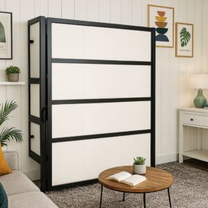 CAMA ABATIBLE DE APERTURA VERTICALAL CON SISTEMA DE APERTURA CON SISTEMA HIDRAHÚLICO PARA COLCHÓN DE 135X190,ESTRUCTURA METÁLICA EN COLOR GRIS, BLANCO O NEGRO, FRONTAL EN DIFERENTES OPCIONES DE COLOR.ESTRUCTURA DE HIERRO DE 60X30,PATAS DE APOYO AL ABRIR,CON 3 BARRAS DE ACERO DE REFUERZO SOBRE EL TABLERO.Medidas:ancho 152,alto 200 ,fondo 35 y 200 abierta.Los amortiguadores de gas aseguran un descenso lento y seguro, permitiendo cerrar las camas sin mayor esfuerzo.Dispone de un seguro anticierre que garantiza que la cama no se cierre nunca por accidente.