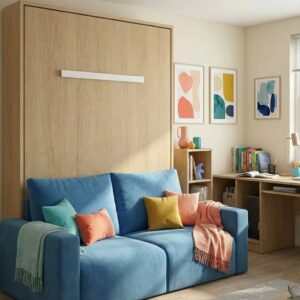 Cama abatible con sistema de apertura vertical con sofá incorporado,con pistones para apertura segura,somier interior de láminas de madera,con rebaje trasero para salvar el zócalo.