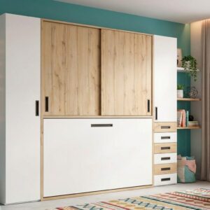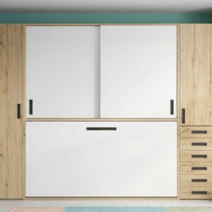 La cama abatible con armario superior es una solución ideal para aprovechar al máximo el espacio sin renunciar a diseño y funcionalidad. Este conjunto incluye armario de 2 puertas correderas y 2 armarios auxiliares de 1 puerta, ofreciendo gran capacidad de almacenaje.