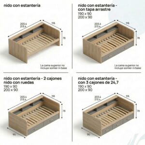 Cama juvenil con práctica estanteria incorporada,con estructura de 3,5 de grosor,para colchón de 90×190(no incluído),necesita somier superior (