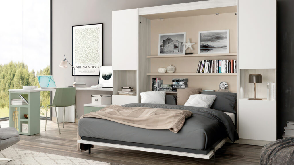 Uno de sus mayores atractivos es la integración total con el mobiliario. Estas camas abatibles pueden formar parte de composiciones completas con armarios, estanterías o escritorios, creando un conjunto armónico y funcional. El resultado es un espacio ordenado, donde cada elemento parece diseñado a medida y perfectamente conectado con el resto.
