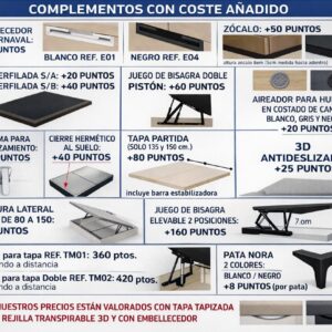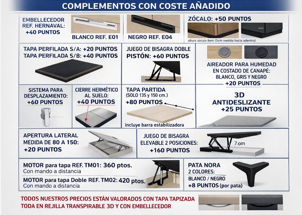 • Todas nuestras tapas son de 7 cm. de grosor y siempre van reforzadas de serie, acolchadas y perforadas para su transpiración sin incremento.