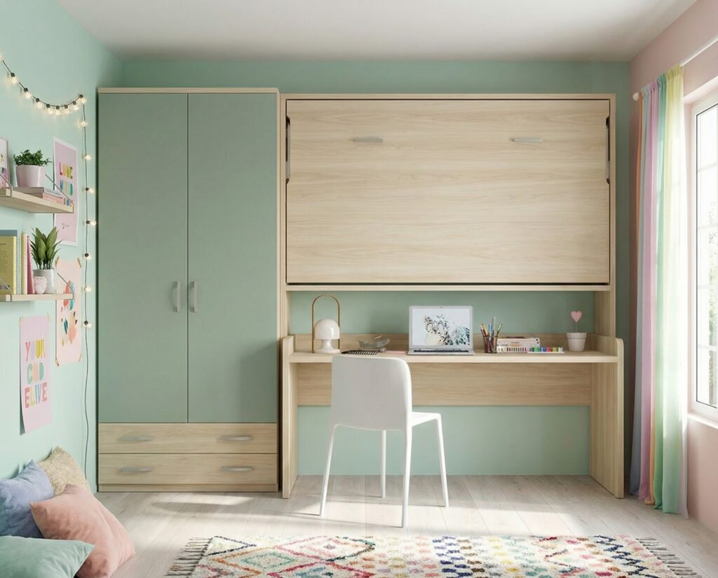 Además, el diseño incorpora un escritorio amplio y práctico, ideal para el estudio o el teletrabajo, perfectamente integrado bajo la cama abatible. Esta solución no solo maximiza el uso del espacio, sino que también mantiene una armonía visual muy cuidada.