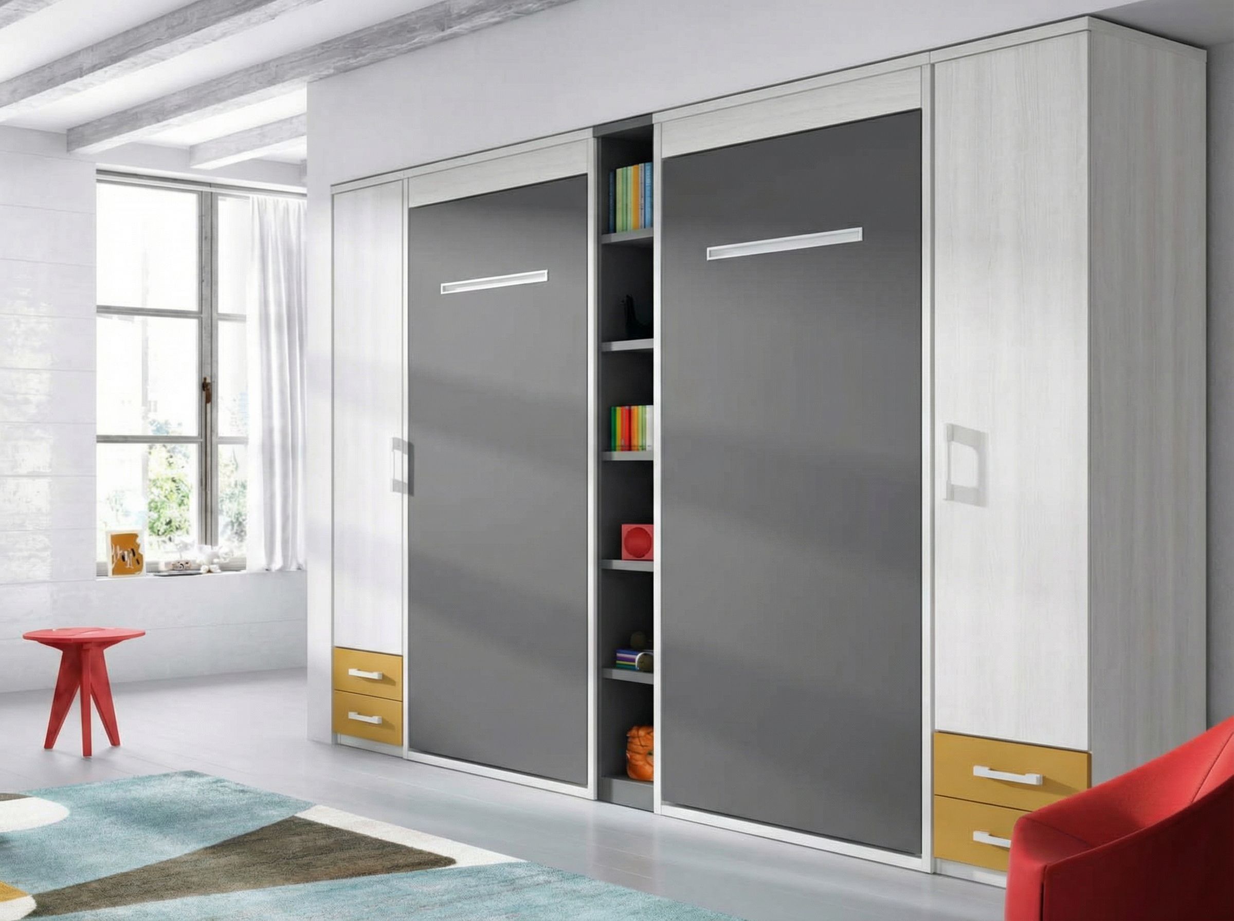 Composición compuesta por 2 camas verticales estantería librería y 2 armarios de 1 puerta y 2 cajones.ESTANTERIA VERICAL NO INCLUIDA EN LA OFERTA.