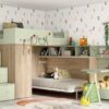 Composición completa con cama abatible juvenil,armario rincón,terminal zapatero,conjunto de mesa estudio y estanterias de pared.