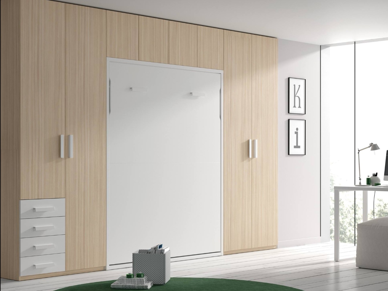 Composición de cama abatible con armarios, dormitorio compuesta por, armario de 2 puertas (78,4 Ancho x 249 Alto x 59 Fondo), cama abatible vertical para colchón de 135 x190 (157 Ancho x 59 de fondo estando la cama cerrada,altillo superior y armario de 2 puertas y 4 cajones (78,4 Ancho x 249 Alto x 59 Fondo).