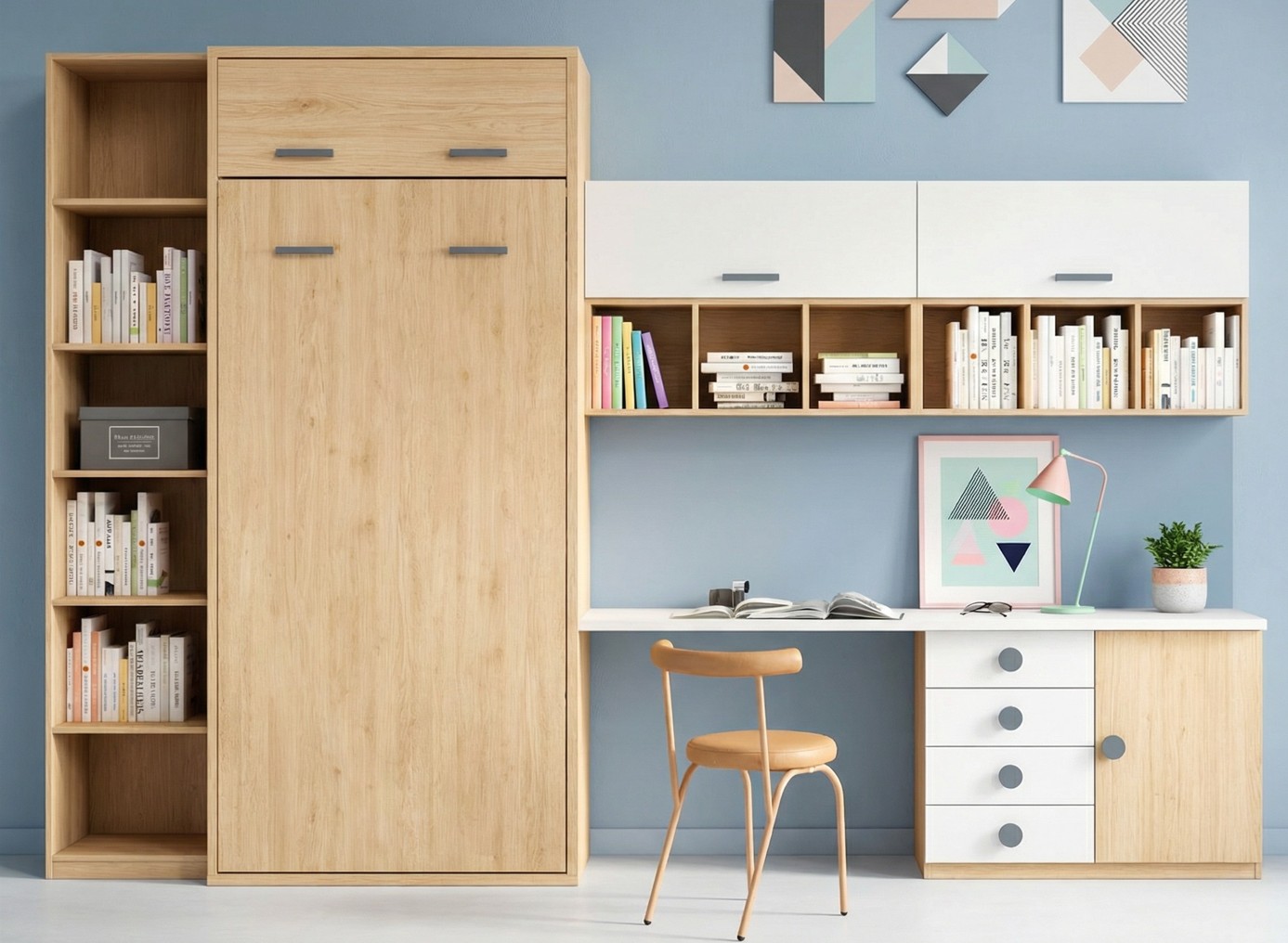 Descubre nuestra cama abatible vertical de 90 cm con altillo superior y escritorio integrado, una solución perfecta para optimizar el espacio en dormitorios juveniles, estudios o pisos pequeños en Badalona y Barcelona.