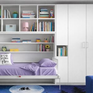 Composición completa de gama alta con cama abatible de matrimonio para colchón de 140×190,(con componentes de seguridad,pistones de apertura retardada y cierre de bloqueo,somier interior,cinchas sujeta colchón,estanteria interior…etc),además de 2 armarios de gran capacidad y altillo libreria.Medida de ancho 332 y de alto 220 (opción en alto 240 y 248),diferentes opciones de color.