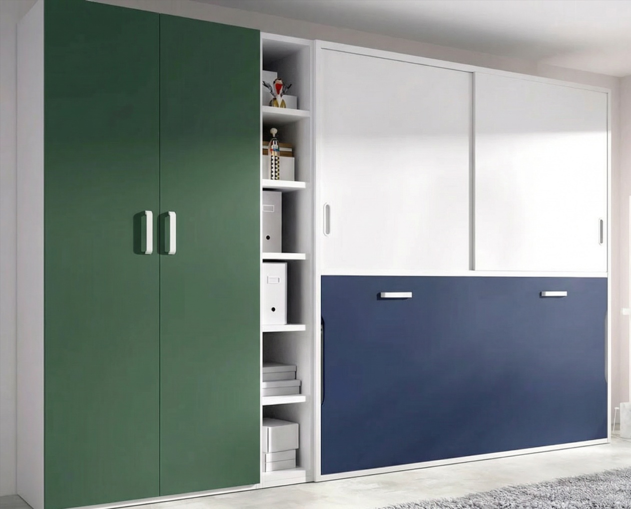 Composición de habitación juvenil con cama abatible con armario superior y armario, ESTANTERIA VERTICAL NO INCLUIDA EN EL PRECIO,producto de gama alta con excelente calidad y acabados,cama abatible con sistema de seguridad, para colchón de 90×190 (no incluído), también opcional para colchón de 80 y 105 de ancho y largos de 180 y 200.