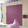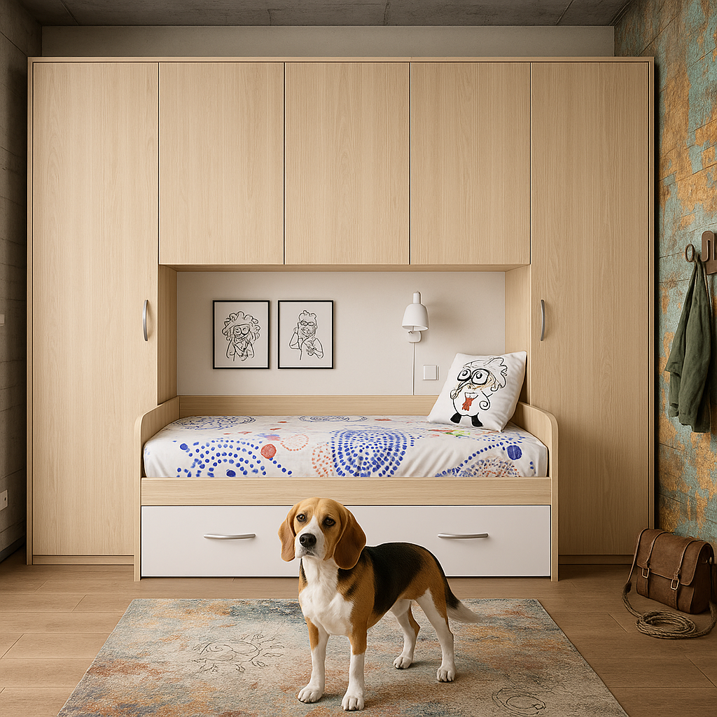 Habitación con altillo puente de 4 puertas con barra metálica de refuerzo,armarios laterales y cama nido con cama inferior extraíble con ruedas y patas desplegables,somier superior no incluído (+50€) en la oferta.Sin corona de cama.