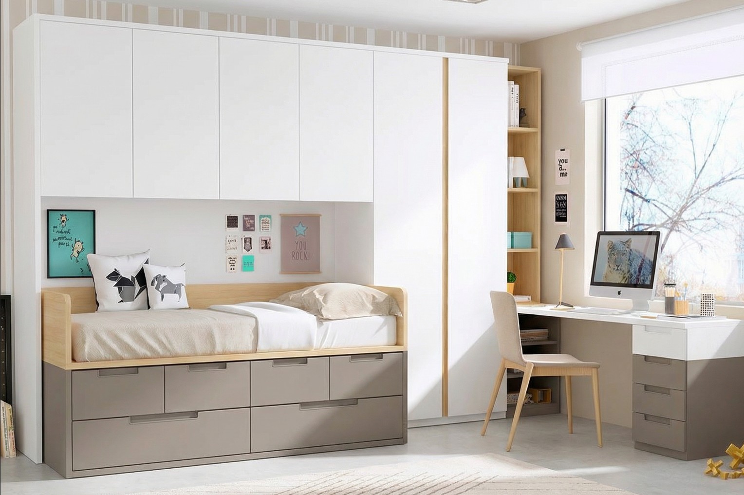Composición juvenil formada por armario de 2 puertas,costado lateral,puente superior de 4 puertas,libreria de 1 cuerpo y cama compacta con corona,4 contenedores y 2 cajones nido inferiores con ruedas.