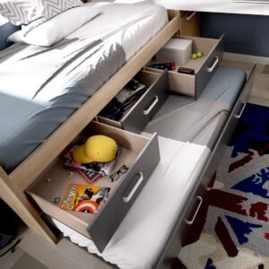 Composición juvenil de cama compacta con contenedores,altillo puente,escritorio con arcón inferior de 1 puerta y armario de 2 puertas.Excelente calidad y acabados,transporte y montaje opcional 175€(hasta 15 km).
