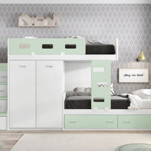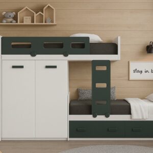 Composición de litera tren, para colchones de 90×190, con módulo escalera lateral, armario de 2 puertas, trasera de madera, baranda, escalera central, y cama inferior de 2 cajones extraíbles con ruedas. Producto de gama alta con excelente acabado, diferentes opciones de color a elegir.