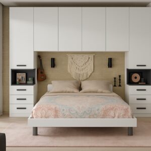 Un mueble puente de matrimonio maximiza el uso del espacio vertical, ofreciendo estantes, cajones y compartimentos que rodean el área de descanso, eliminando la necesidad de armarios adicionales.