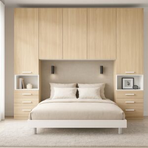 El armario puente no solo es práctico, sino que también aporta un toque moderno y minimalista al dormitorio, ya que está disponible en una amplia gama de acabados, desde madera natural hasta opciones más contemporáneas en melamina.