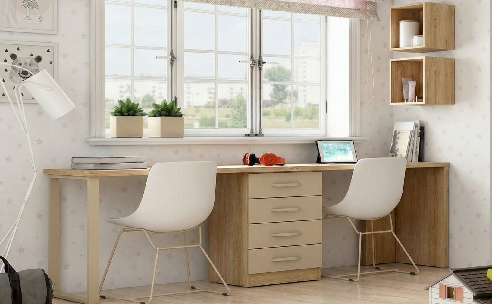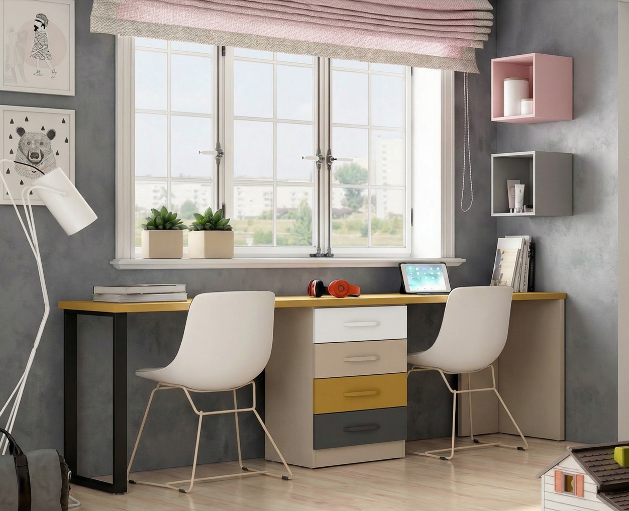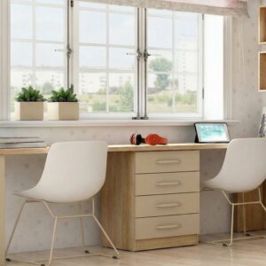 Escritorio doble juvenil moderno con cajonera multicolor.