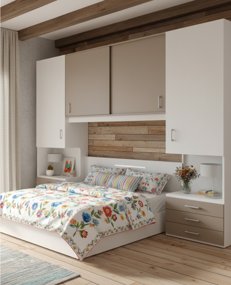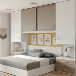 Transforma tu dormitorio con nuestro exclusivo dormitorio de matrimonio con armario puente, diseñado meticulosamente para ofrecer la máxima funcionalidad y aprovechamiento del espacio sin sacrificar el estilo y la elegancia. Este conjunto integral está pensado para parejas que buscan optimizar cada centímetro de su habitación, combinando diseño moderno con solucion práctica de almacenamiento.