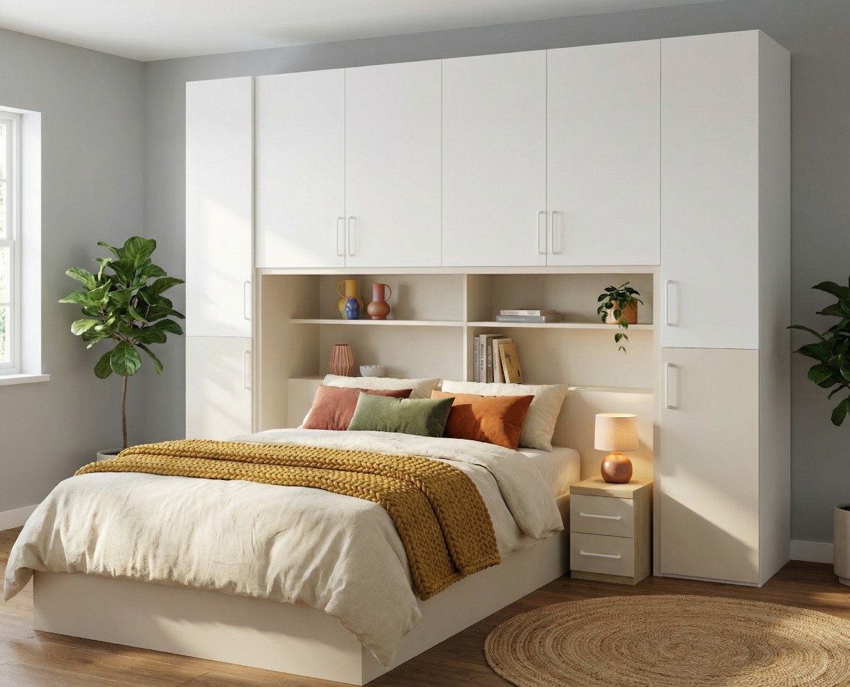 Descubre esta composición de dormitorio de matrimonio tipo puente de excelente calidad, ideal para aprovechar al máximo el espacio con un diseño funcional y elegante. En Muebles Detena en Badalona, te ofrecemos soluciones prácticas con acabados cuidados y gran capacidad de almacenaje.