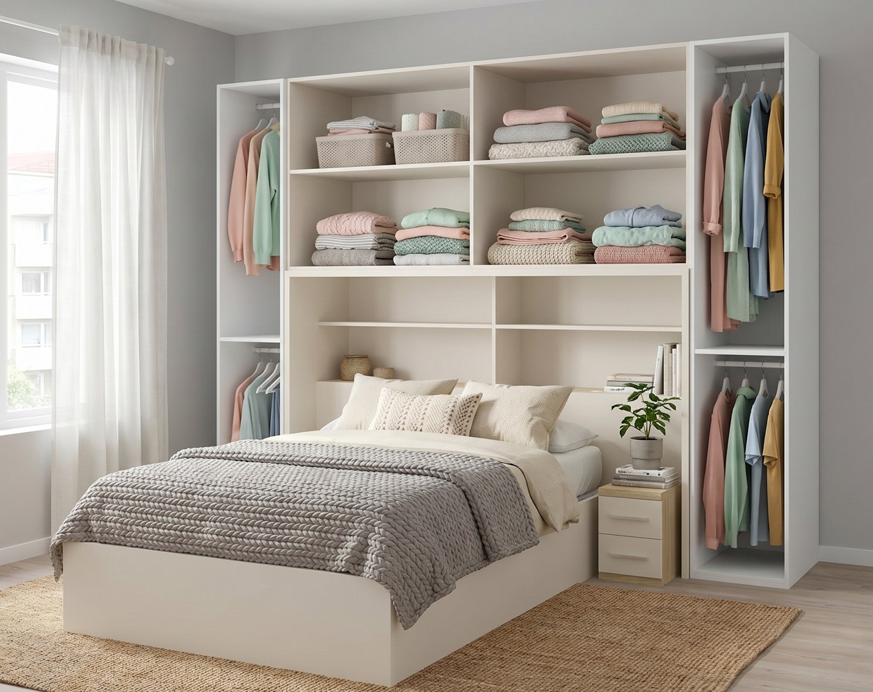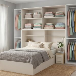 Este dormitorio incluye un puente con altillo de 4 puertas de gran capacidad, perfecto para organizar ropa, mantas o accesorios. Incorpora además un panel trasero con estanterías y 2 baúles de almacenaje en la zona del cabezal,2 mesitas de 3 cajones y armarios de doble puerta y doble barra de colgar ropa,total 4 barras, aportando aún más espacio útil.