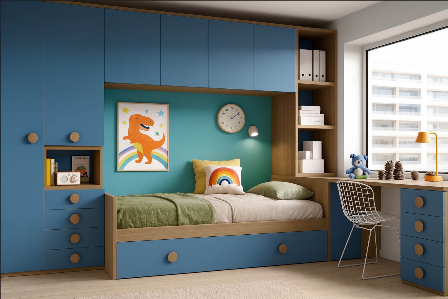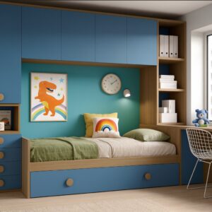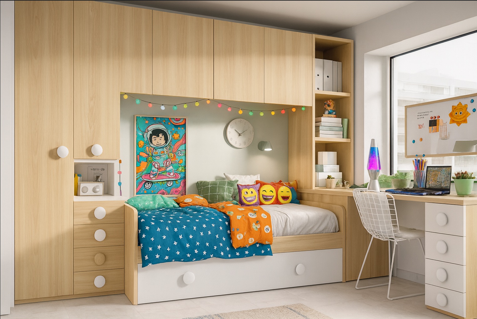 Habitación juvenil,completísima con altillo puente superior de 4 puertas con barra metálica de soporte,doble cama nido,amplio armario de 1 metro de ancho con estanteria,cajones y 2 puertas.Además de escritorio con cajones,estanteria vertical y arcón extraíble zapatero.