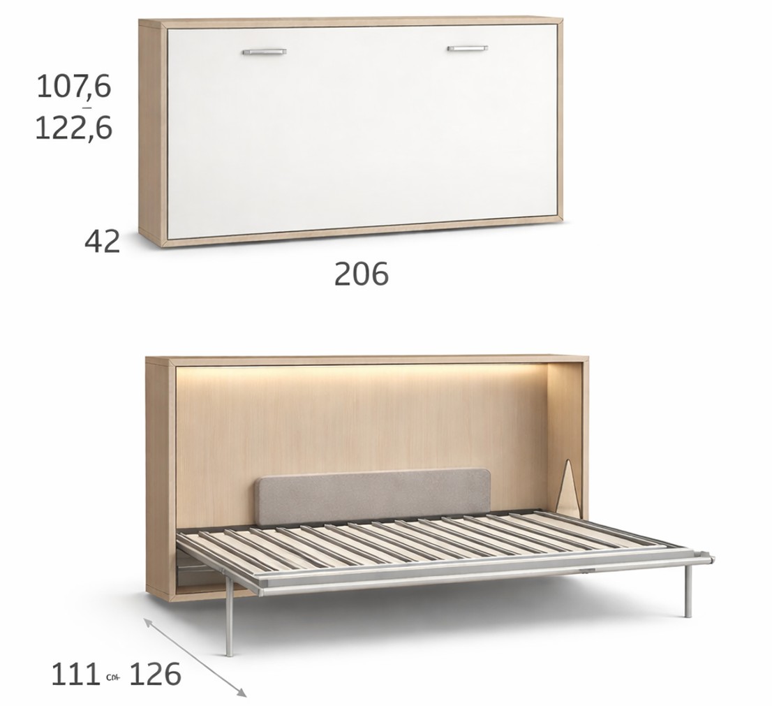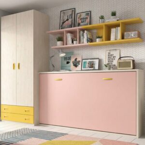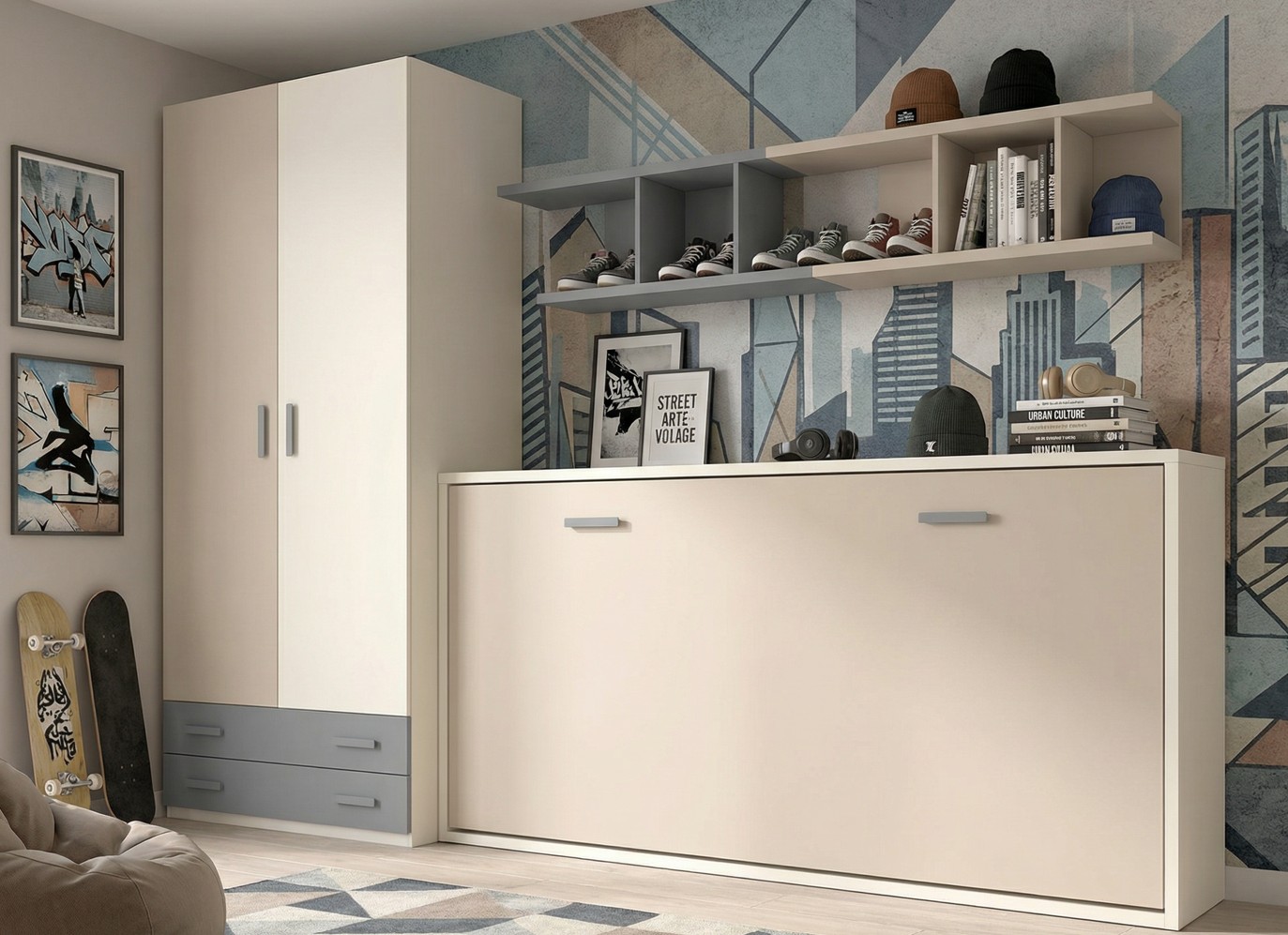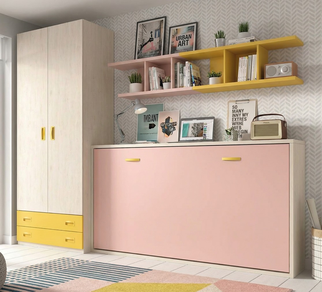 Composición juvenil de cama abatible horizontal,armario de 2 puertas y 2 cajones y (estanterias superior de pared no incluídas en la oferta).
