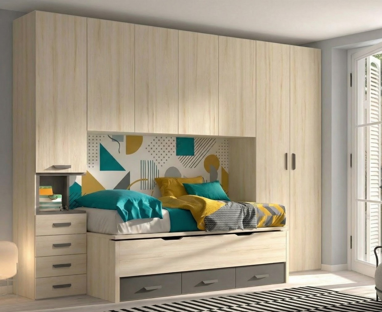 En Muebles Detena, tu tienda de muebles en Badalona, te presentamos el Dormitorio Puente Juvenil WIN05, una solución completa, funcional y moderna para habitaciones juveniles.