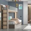 Litera de matrimonio en la parte inferior y contenedores ,e individual en la parte superior, cama inferior de 135 x 190, módulo escalera de cajones litera 45 ancho.