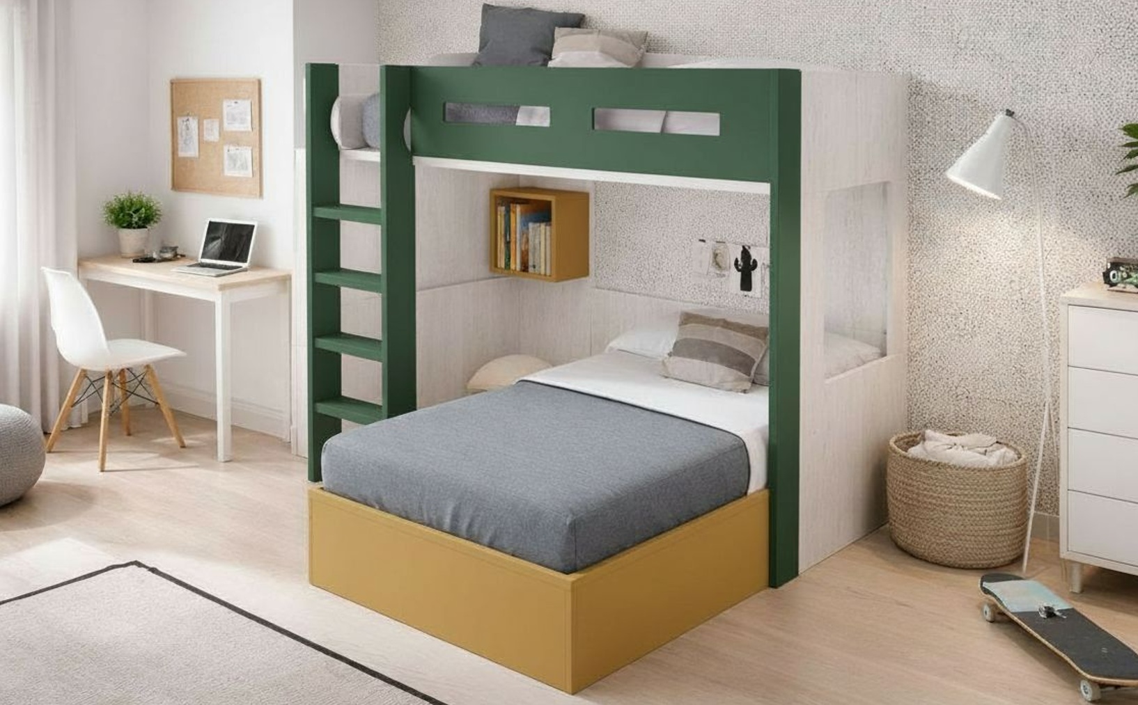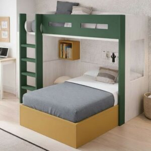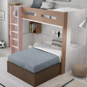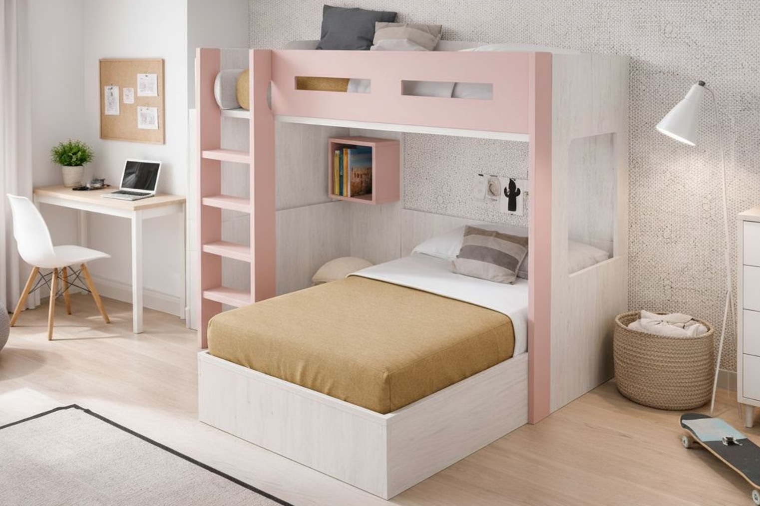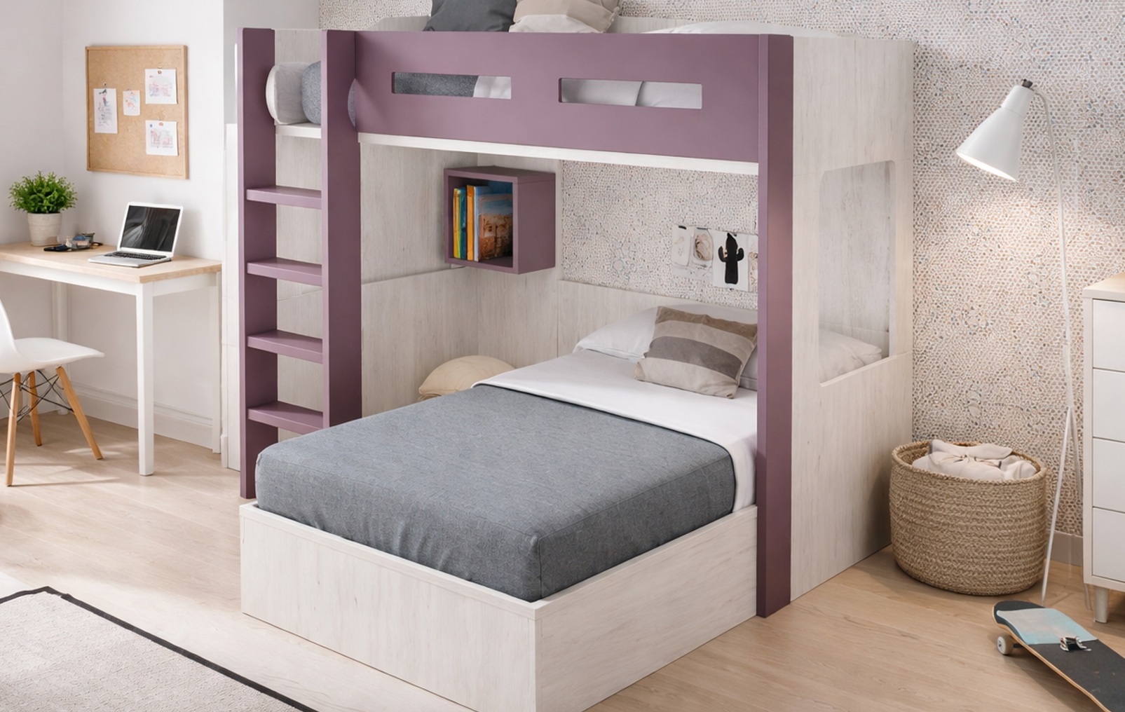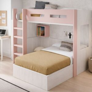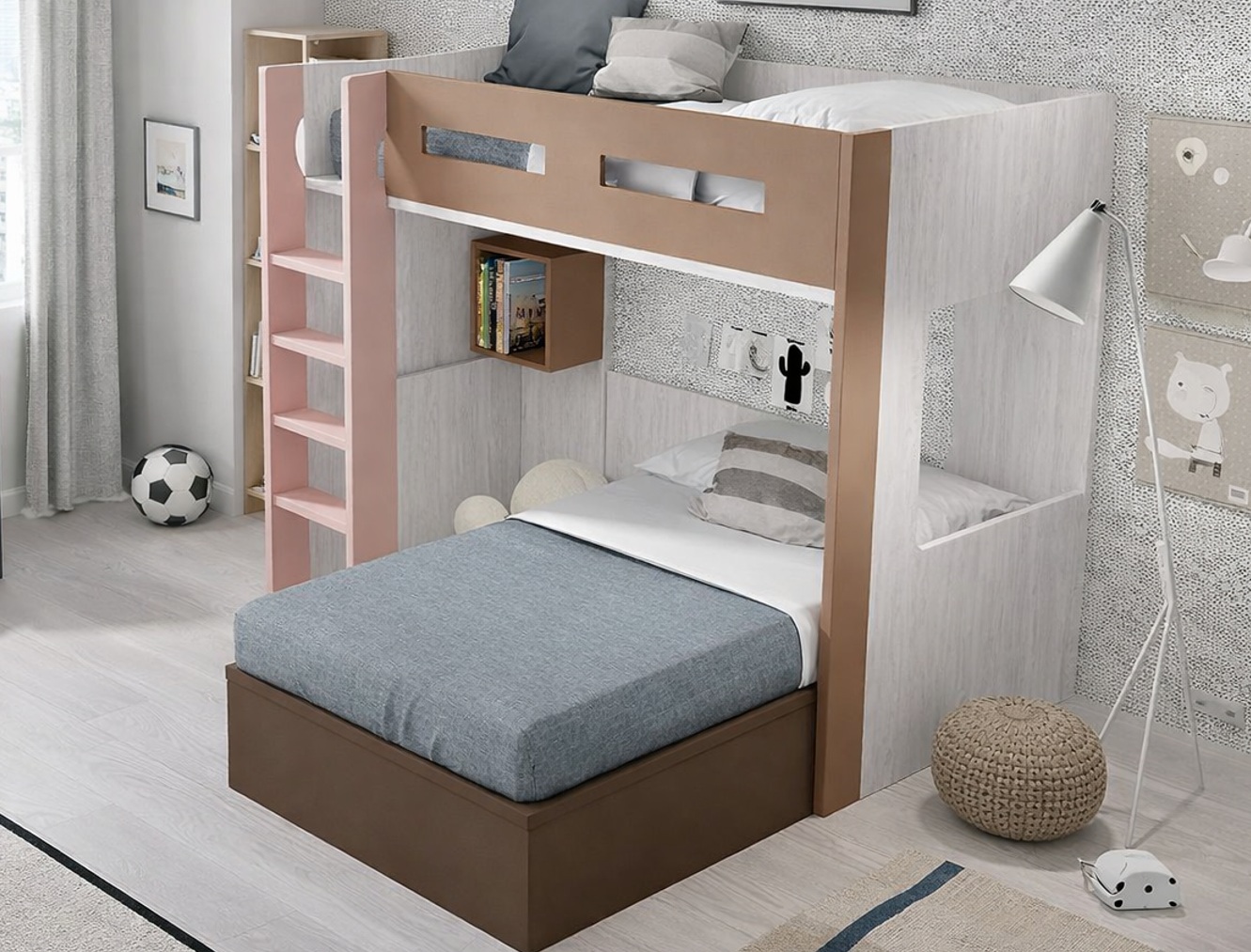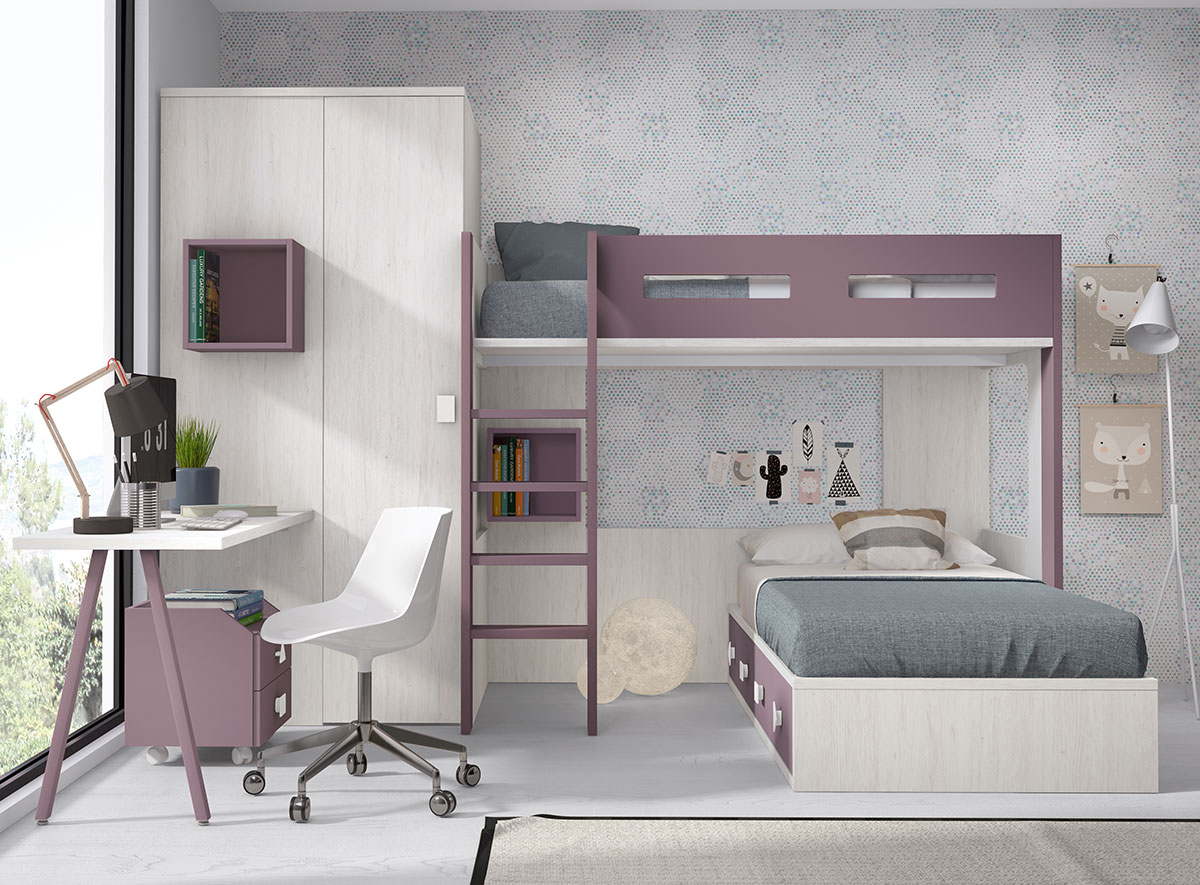 Fantástica litera en forma de L con un precioso diseño y una calidad excepcional, para colchones de 90×190 (no incluídos). Incluye escalera, baranda, cama canapé abatible inferior.
