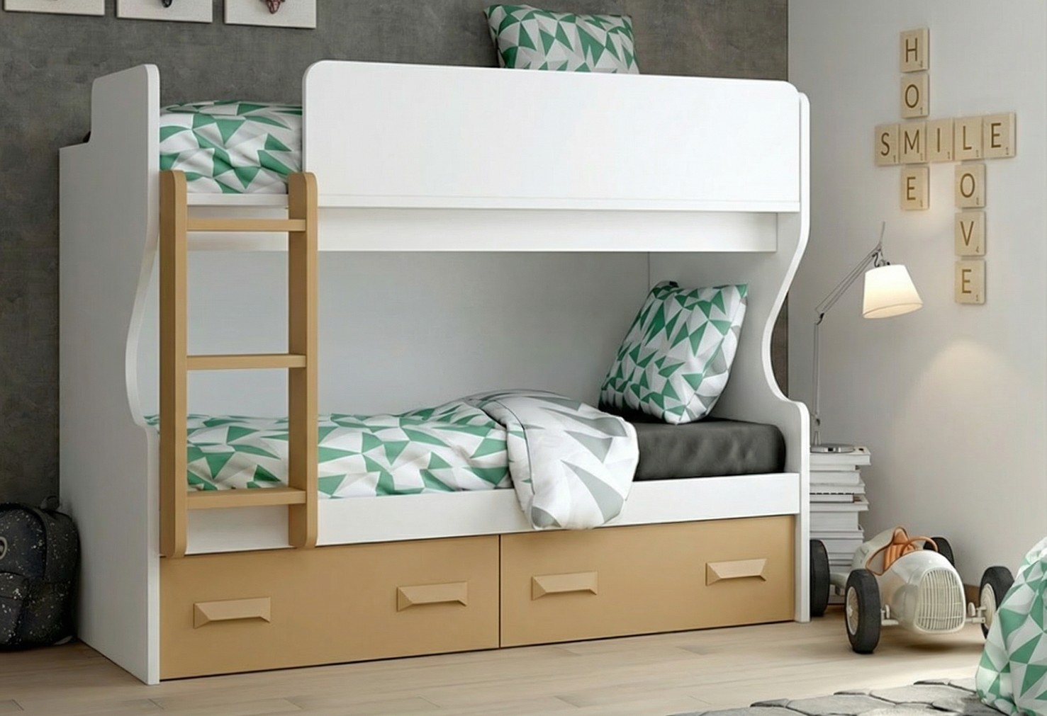 Litera juvenil con excelente acabado, estabilidad y diseño, para colchones de 90×190 (no incluidos). La oferta incluye escalera (de madera o metal) , baranda y trasera.