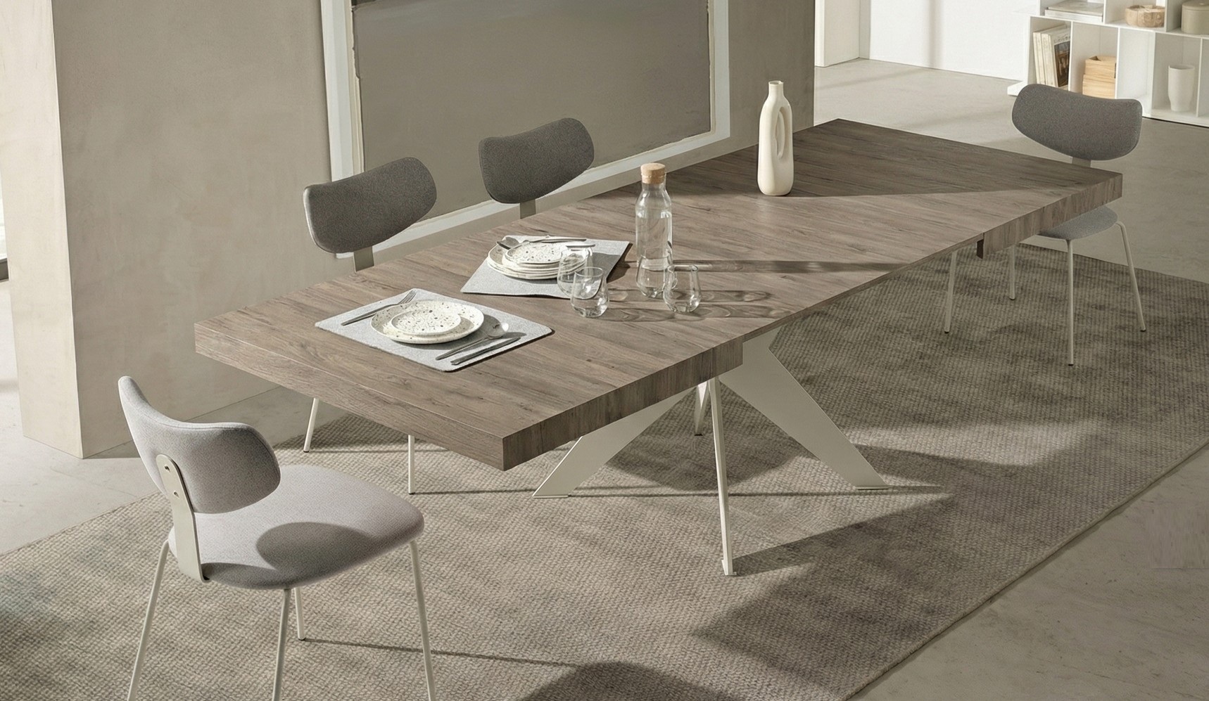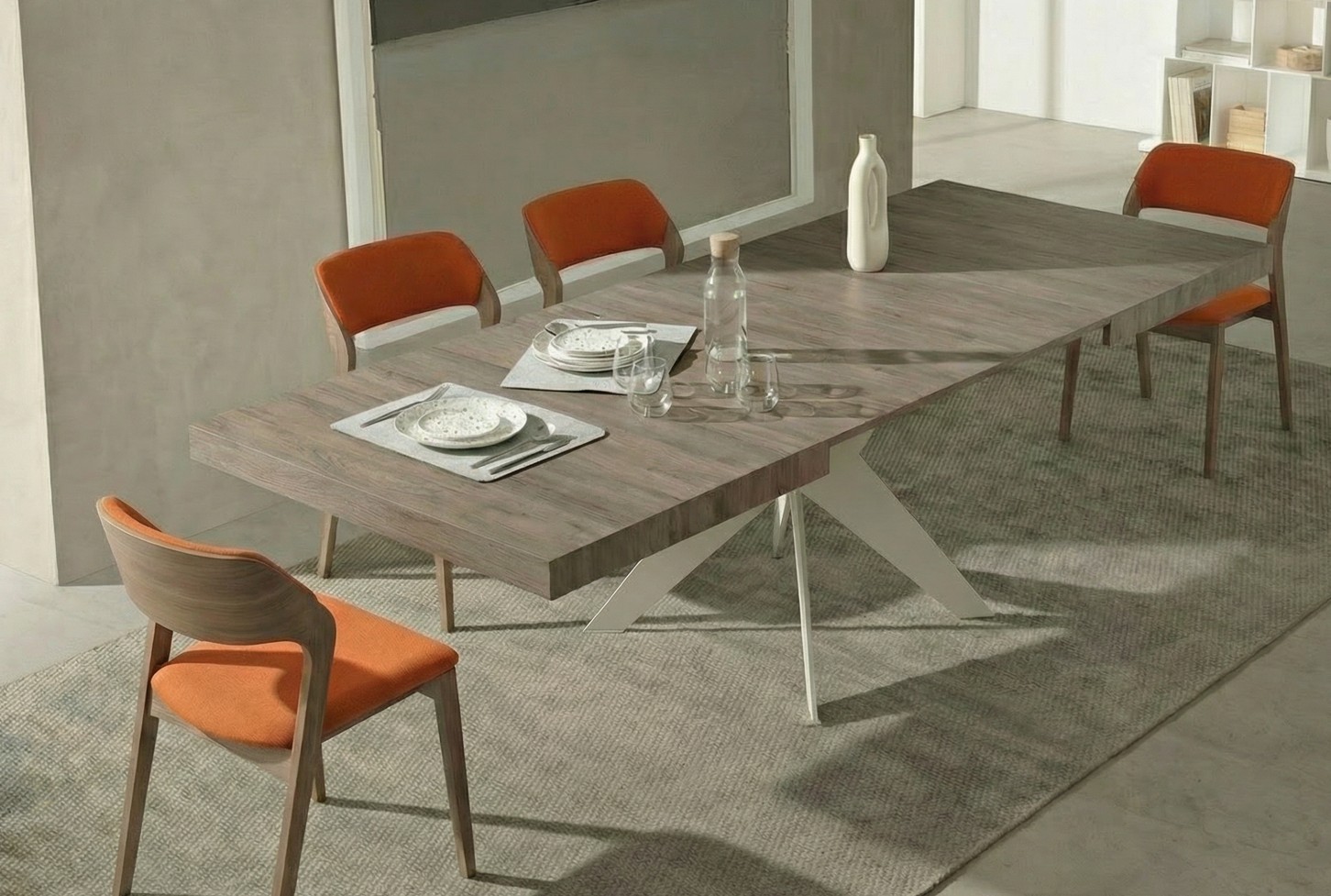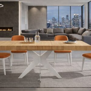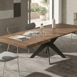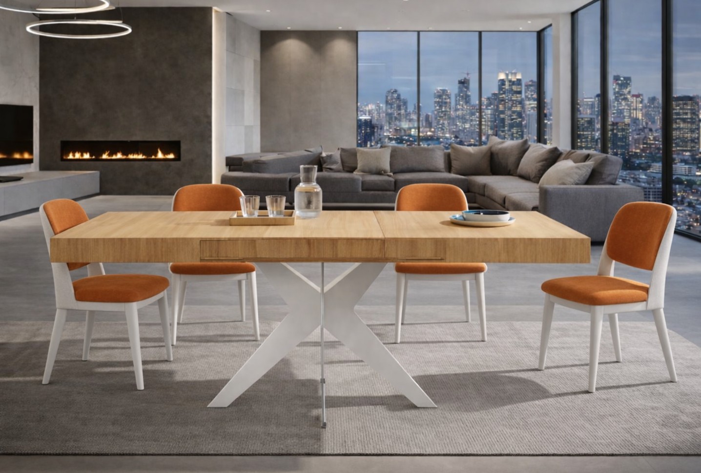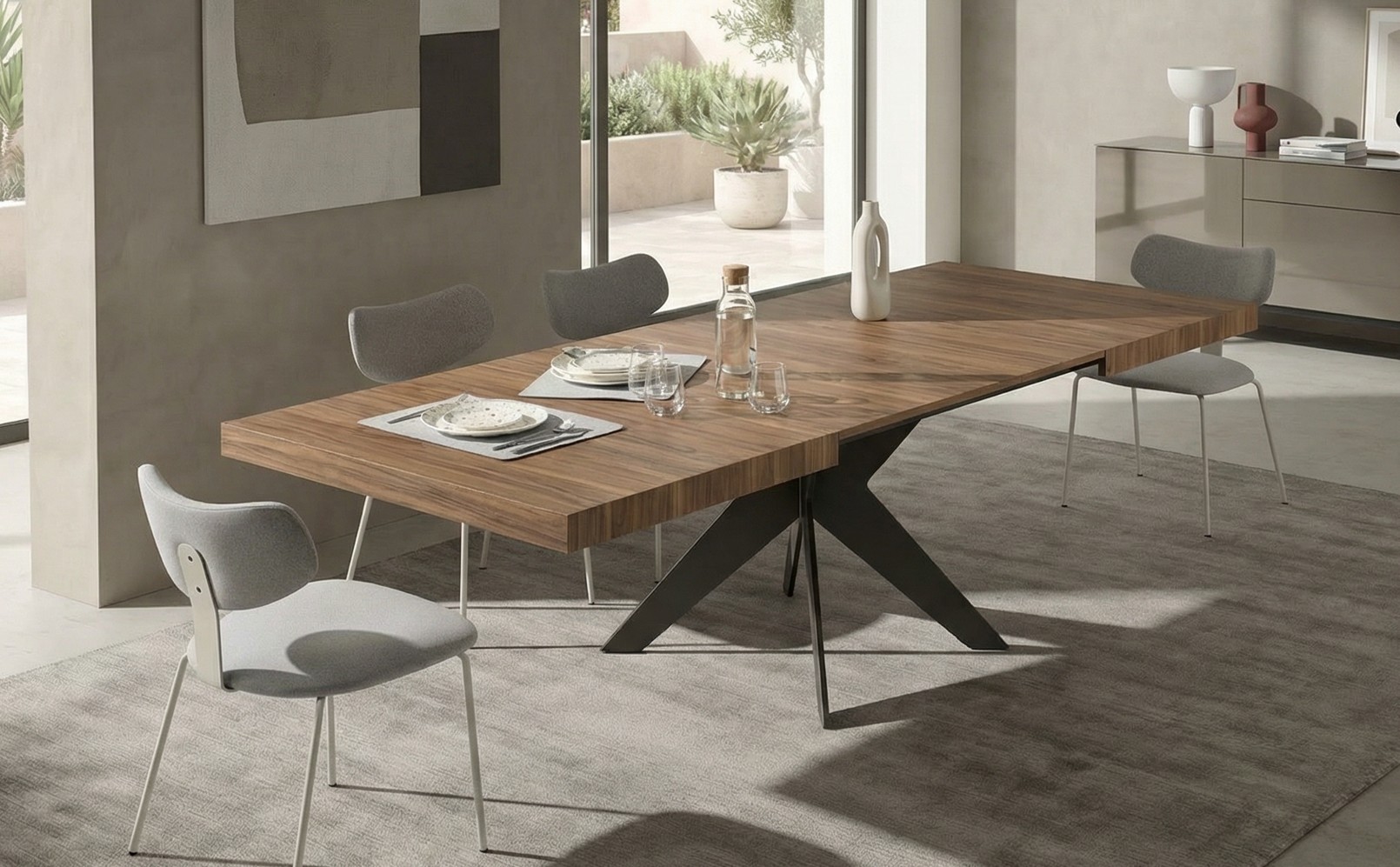 Mesa de comedor, con pie central metálico de acero y extensible con apertura y cierre automático.