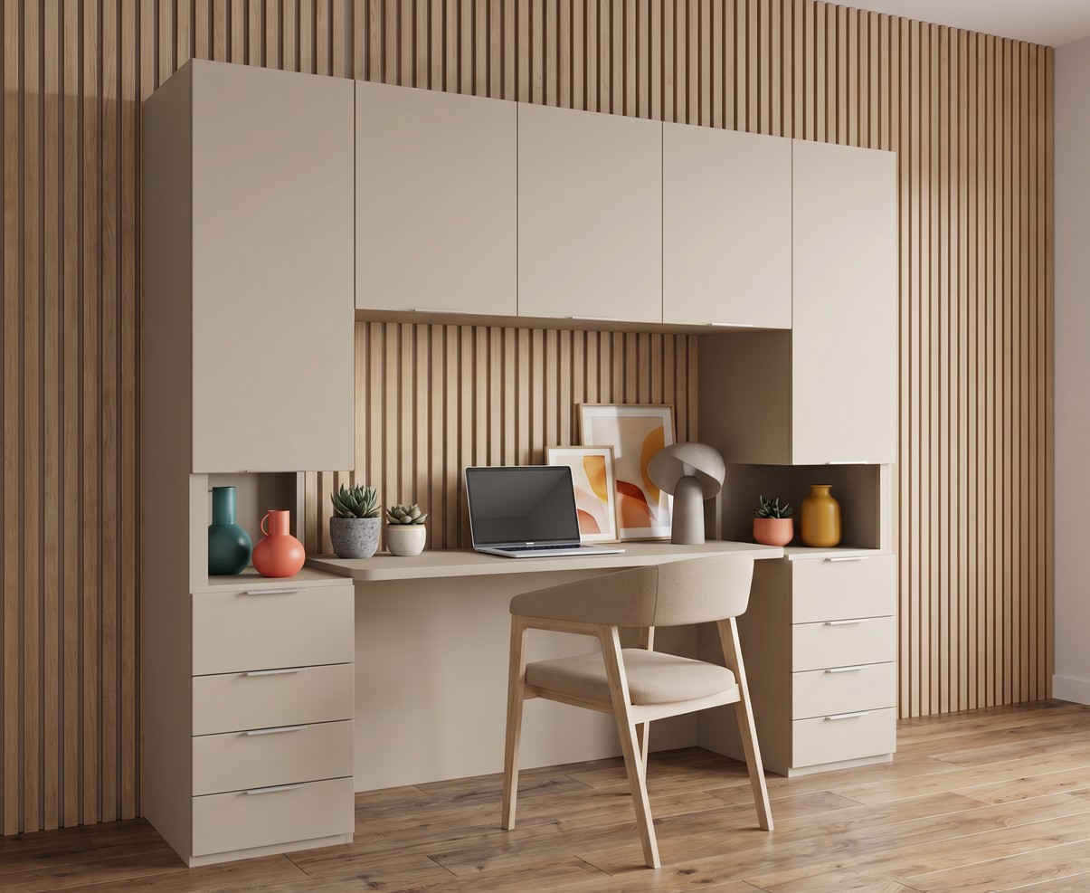 Este conjunto incorpora altillo de tres puertas con barra de acero de soporte, además de armarios, cajoneras y huecos decorativos, ideal para maximizar el almacenaje en zonas de estudio, dormitorios juveniles o salones.