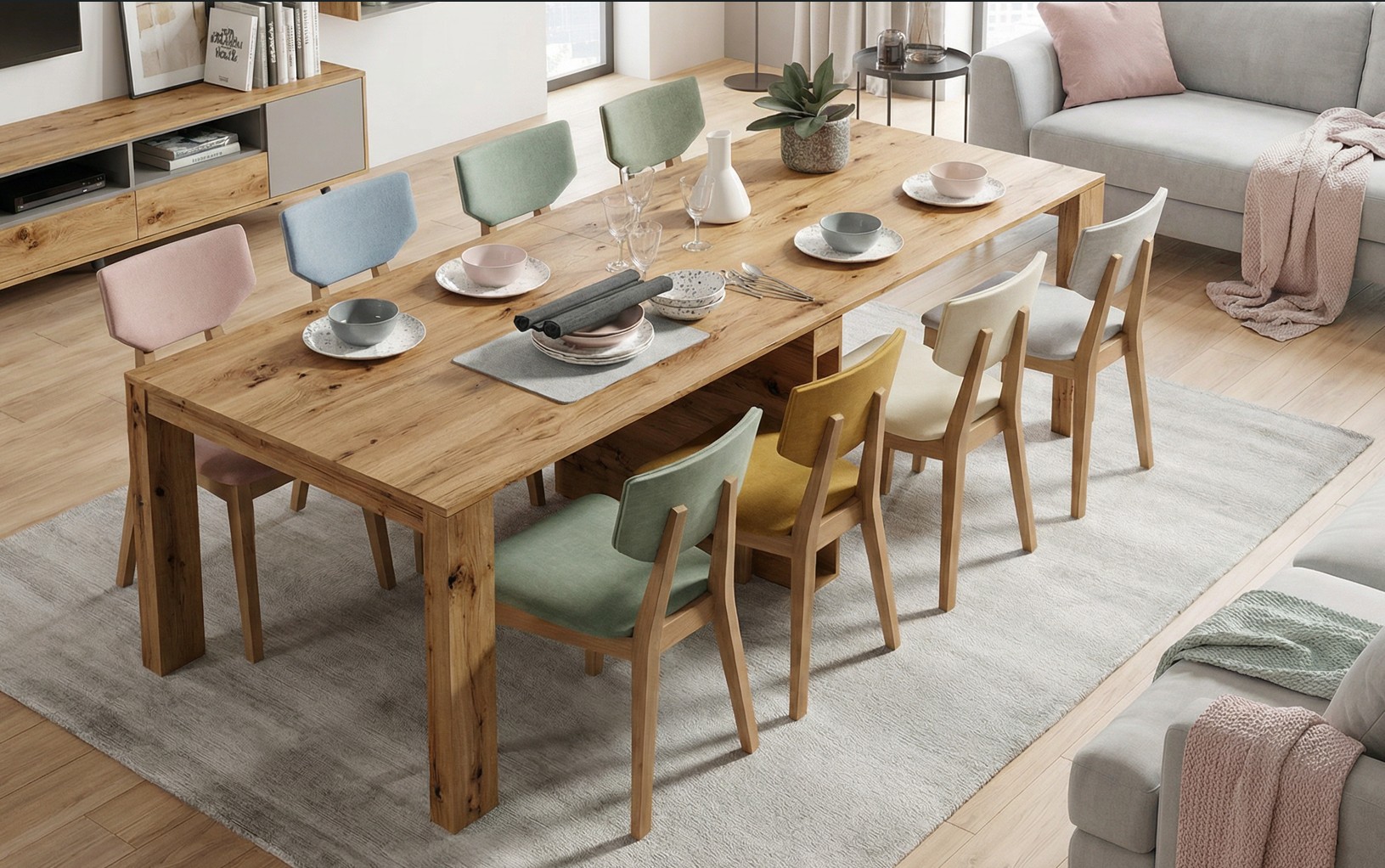 Incluye 4 tableros extensibles que se acoplan según la necesidad, permitiendo ampliar la mesa de forma rápida y sencilla. Es una solución ideal para pisos pequeños, salones o recibidores, combinando funcionalidad, diseño y ahorro de espacio.