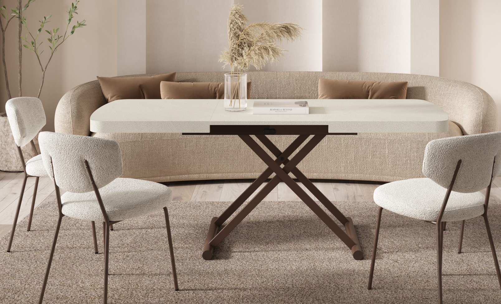 Su sistema de elevación motorizada y la apertura central sincronizada permiten convertirlas fácilmente de mesa de centro a mesa de comedor. Con extensibles de 60 cm y diferentes medidas disponibles, son la opción ideal para aprovechar al máximo cada espacio.