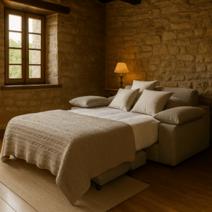Plazo de entrega 15 dias,otras opciones de color y tapizado a elegir +70€,cama de 140×190,ancho del sofá 200 cms.Medida estando abierto 205cms.Cojines decorativos no incluídos.