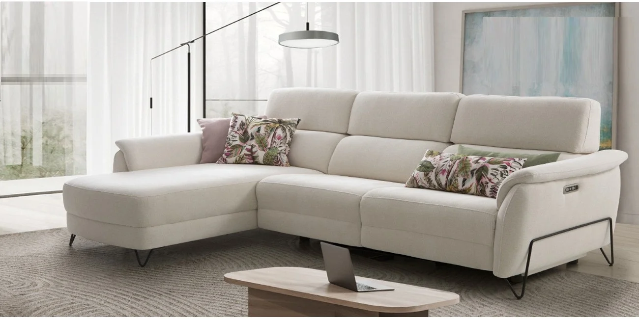 ESTRUCTURA Madera de pino macizo. Chasis de acero en módulos con relax motorizados.ASIENTOS Desenfundables .2 cojines decorativos incluidos.Patas altas ideal para limpieza con roomba.