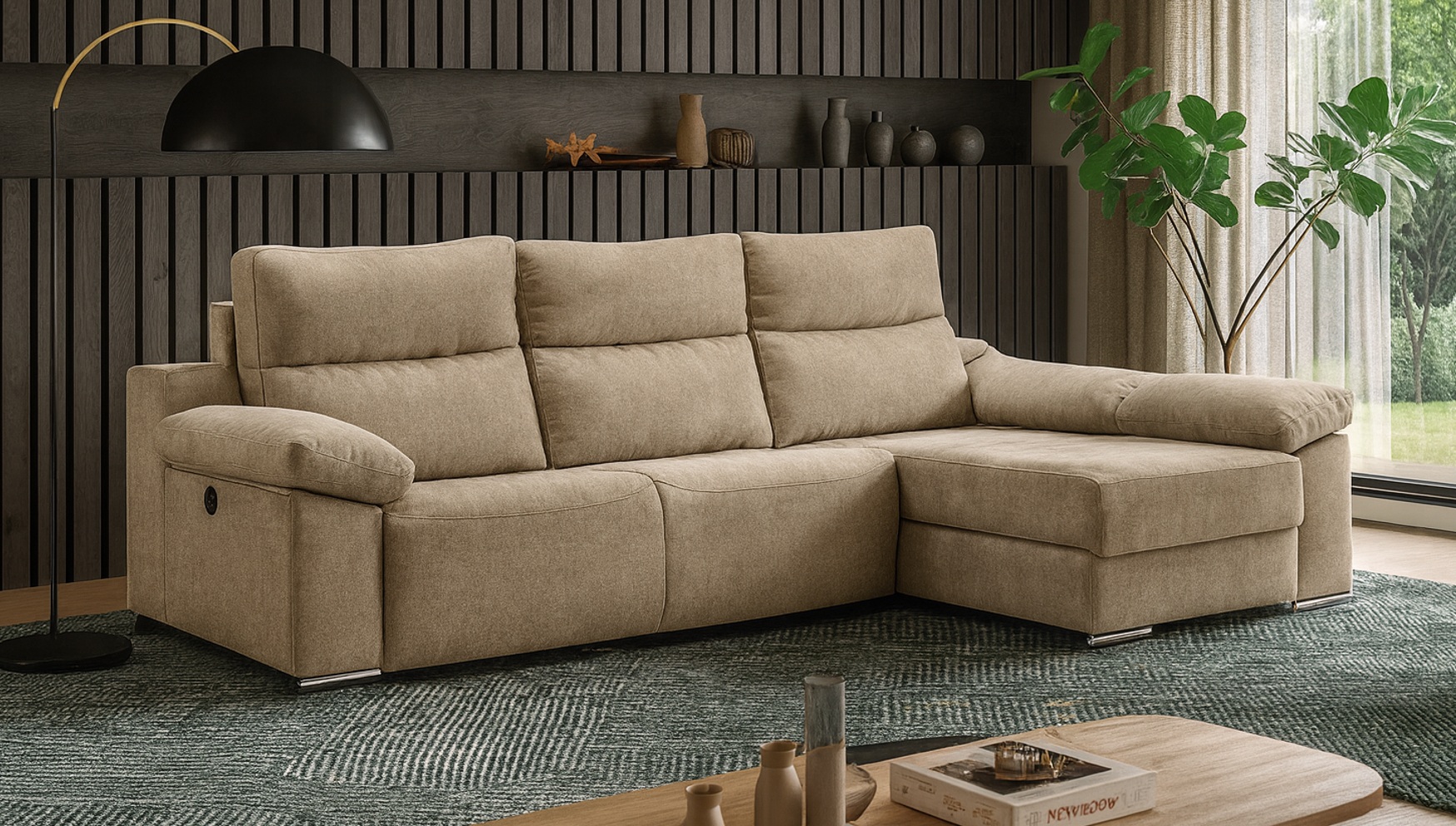 Dispone de 2 relax eléctricos pared 0 que permiten reclinar sin necesidad de separarse de la pared, una chaiselongue Derecha (vista de frente) con arcón de apertura asistida por muelle y un práctico arcón adicional en el brazo. Además, el modelo es completamente desenfundable e incluye 2 cojines decorativos, patas metálicas cromadas y control con puerto USB.